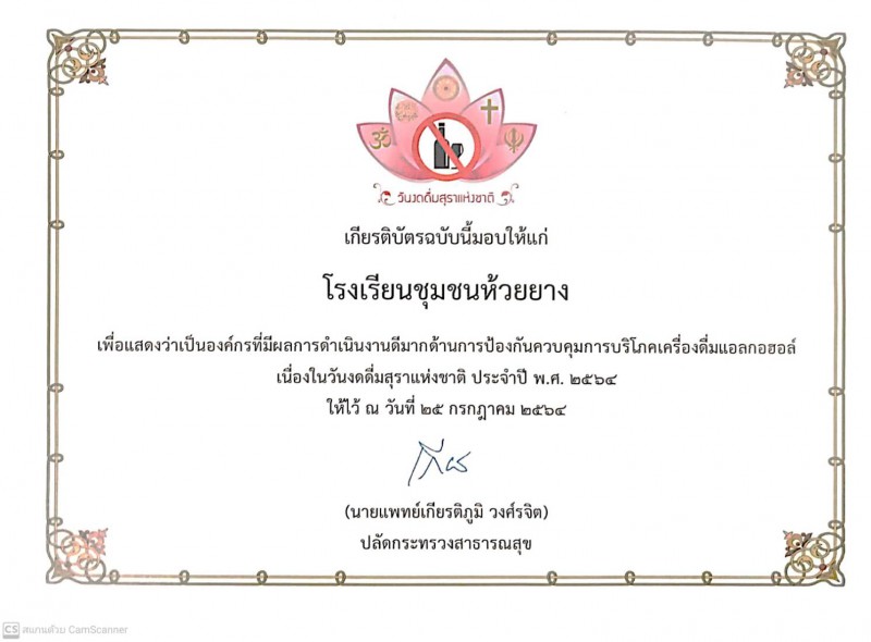 วันที่ 3 ส.ค.64 รร.ชุมชนห้วยยาง รับเกียรติบัตรองค์กรที่มีผลการดำเนินงานดีมาก ด้านการป้องกันควบคุมการบริโภคเครื่องดื่มแอลกอฮอล์ จากนายแพทย์สาธารณสุข จังหวัดชัยภูมิ