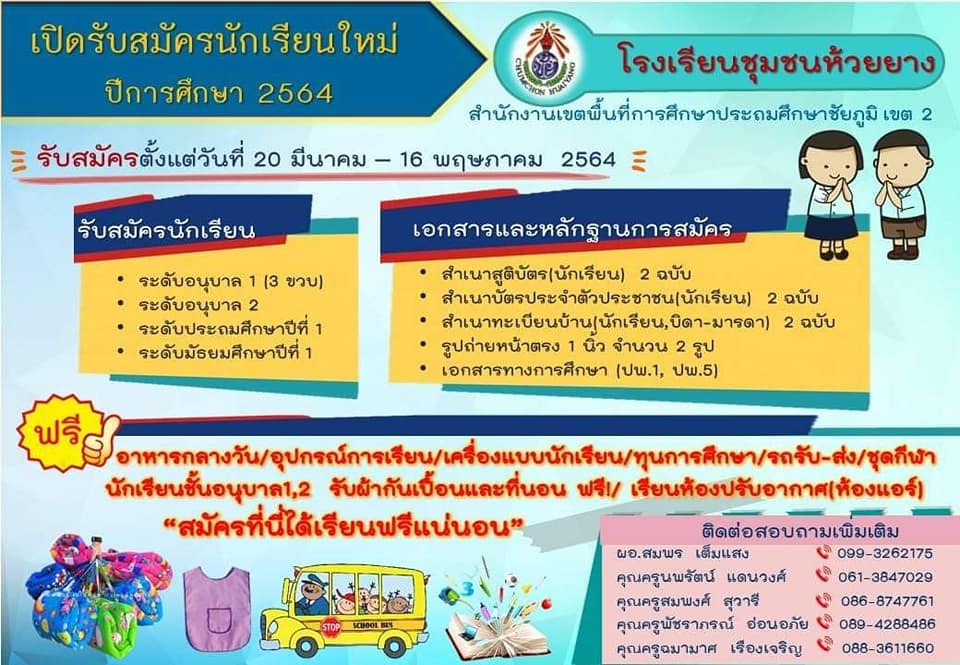 | ประชาสัมพันธ์ถึงนักเรียนและผู้ปกครอง โรงเรียนชุมชนห้วยยางรับสมัครนักเรียนวันที่ ๒๐ มีนาคม ถึงวันที่ ๑๖ พฤษภาคม ๒๕๖๔ อนุบาล๑ อายุ๓ขวบ อนุบาล๒ ป.๑และม.๑ สมัครได้ที่โรงเรียนชุมชนห้วยยาง รายละเอียดตามเอกสารประชาสัมพันธ์นี้ |