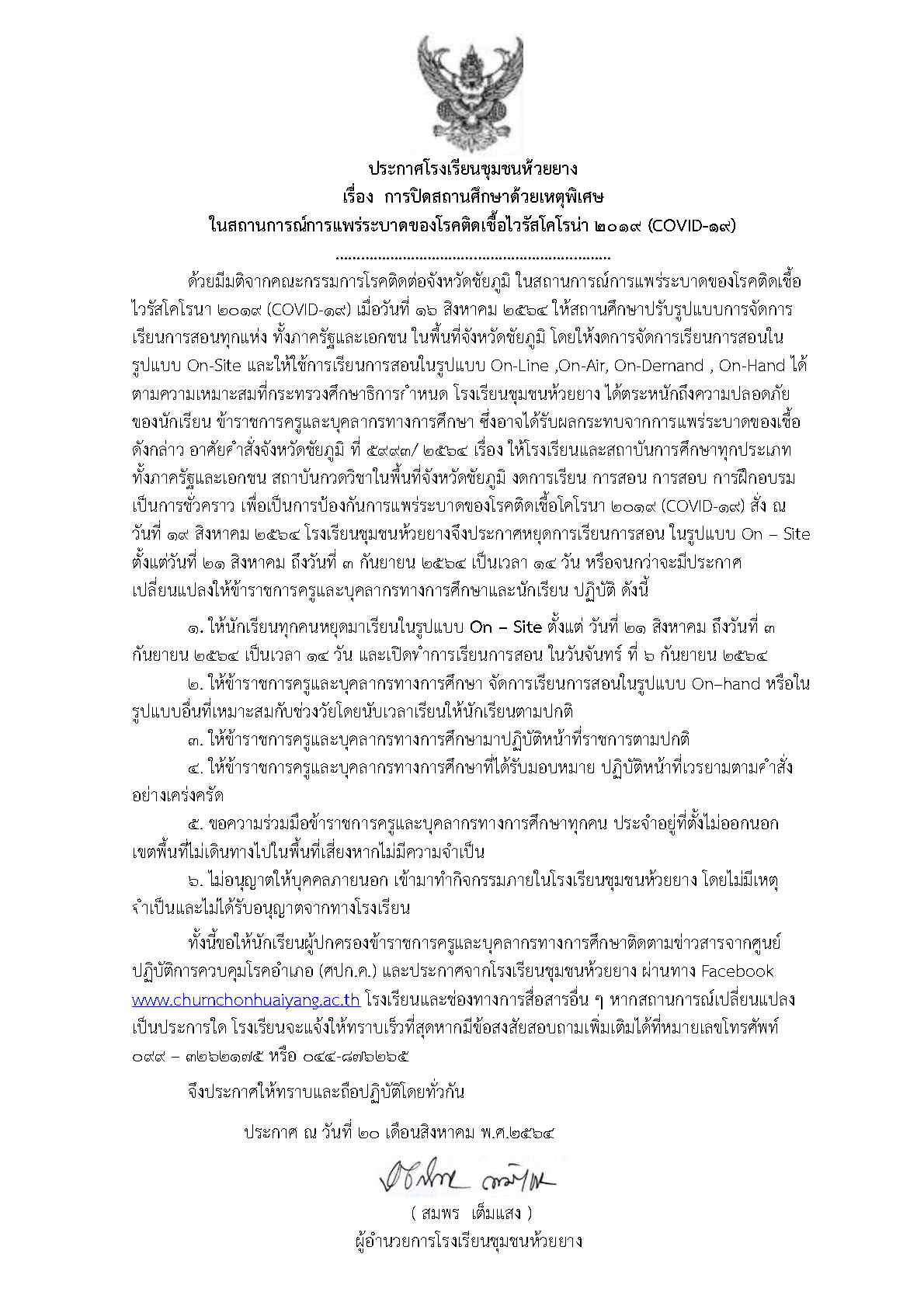 ประกาศโรงเรียนชุมชนห้วยยาง เรื่อง การปิดสถานศึกษาด้วยเหตุพิเศษ ในสถานการณ์การแพร่ระบาดของโรคติดเชื้อไวรัสโคโรน่า ๒๐๑๙ (COVID-19)